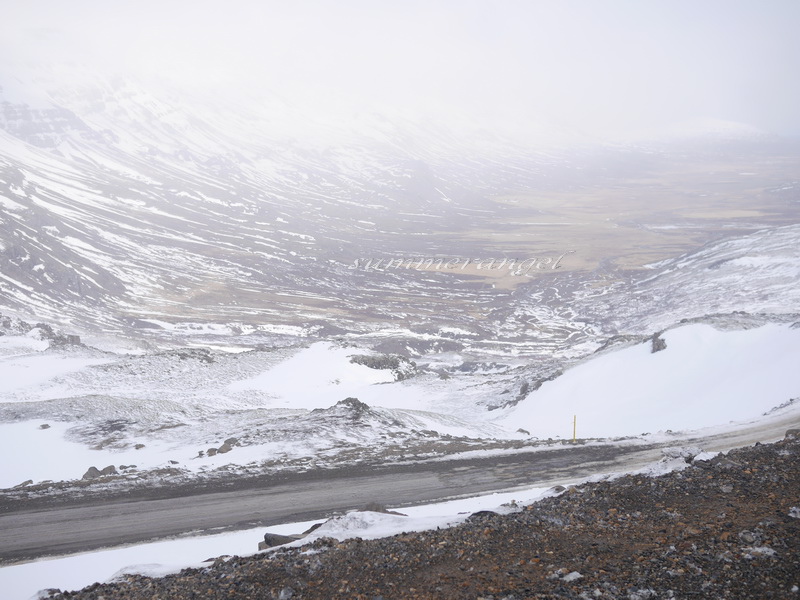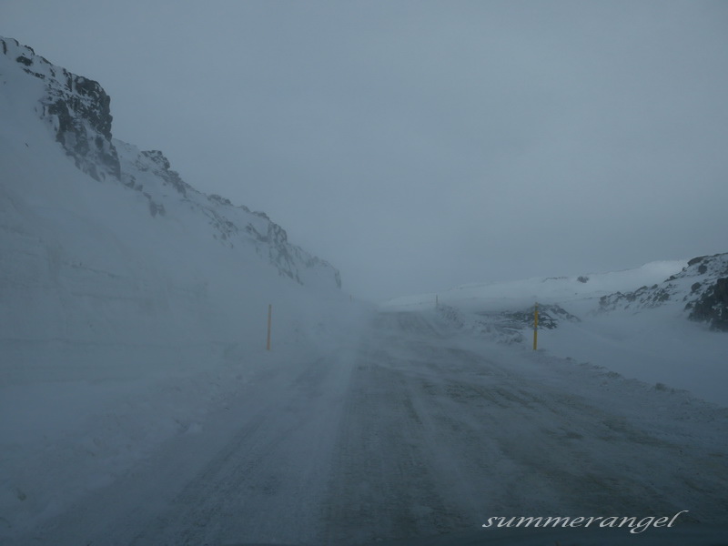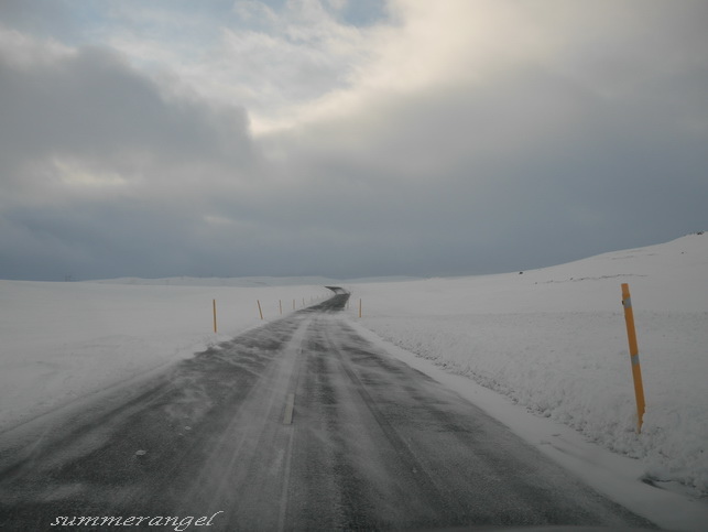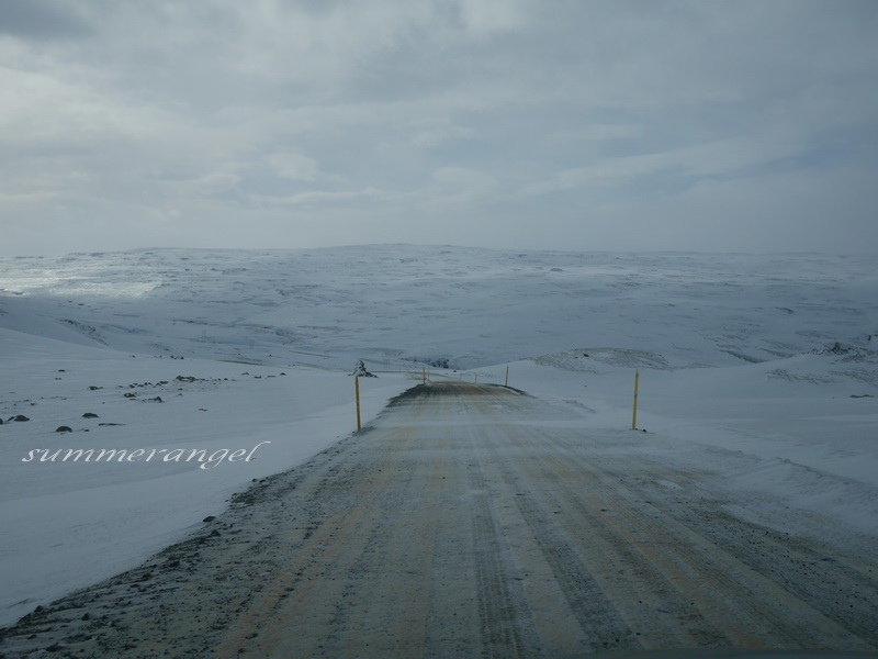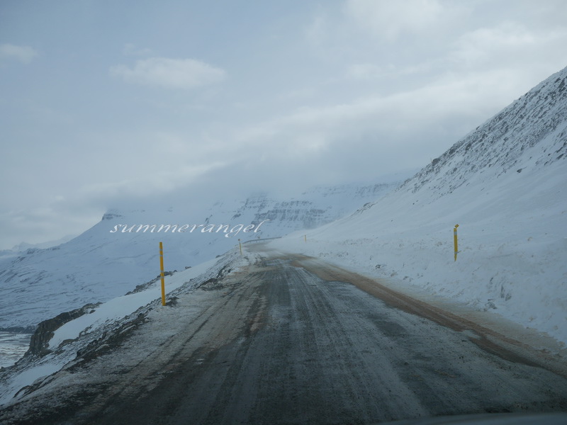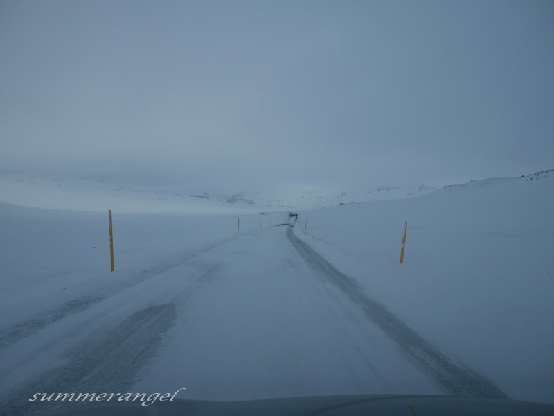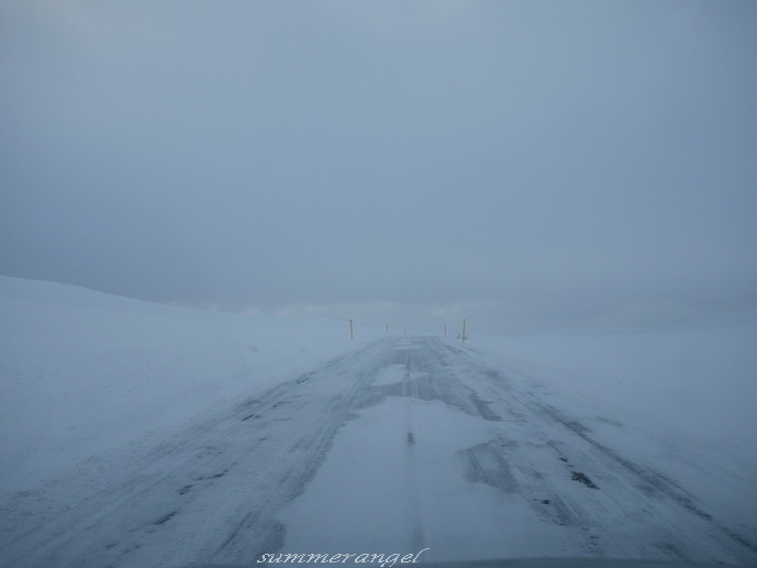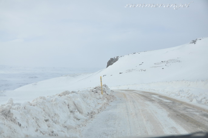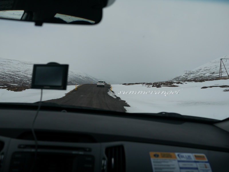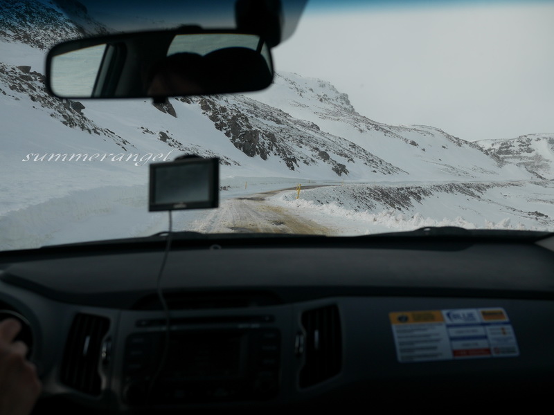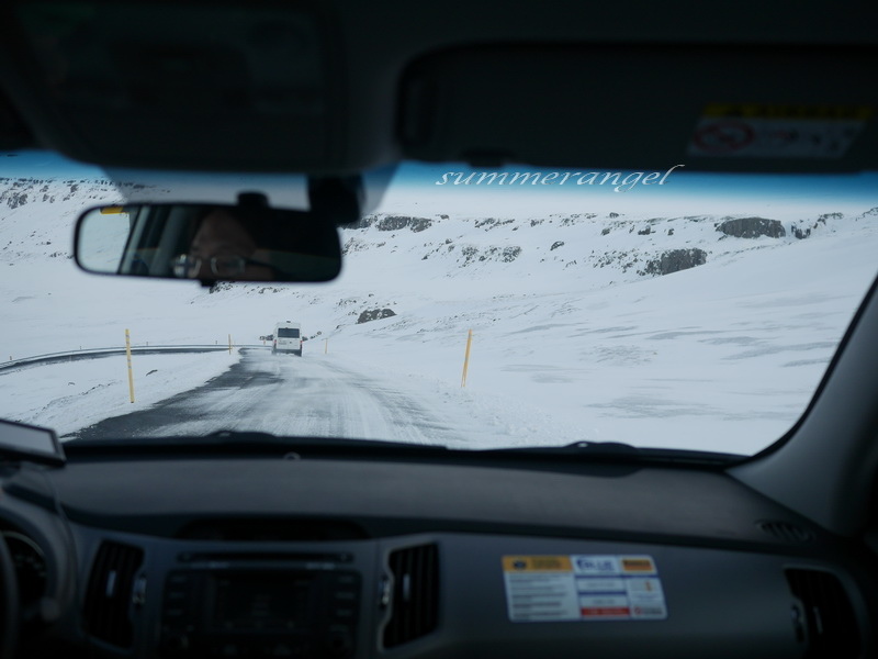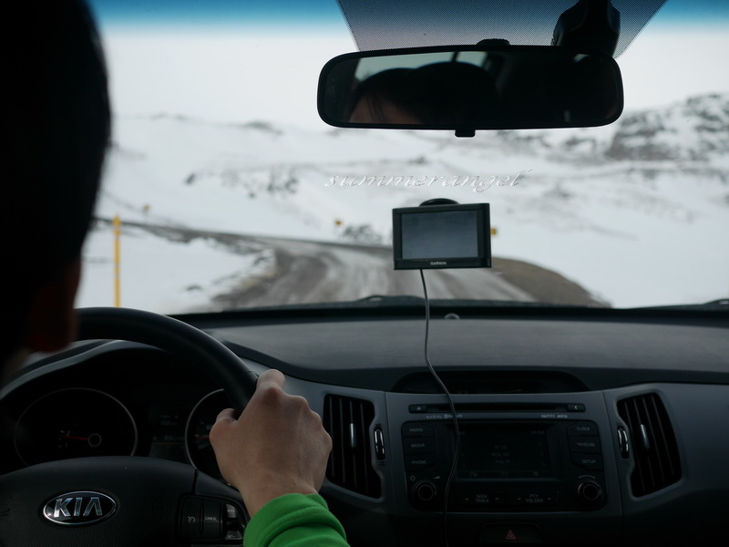 接下來要開上將近三小時才會抵達我們今晚下榻的Vinland Guesthouse,隨後轉往白日夢冒險王的場景小鎮。看這張圖就知道我們有一半的車程幾乎是沿著海岸走,之後切進台地。今天,我們終於遇到讓我害怕的大風雪,也懂為什麼當初老公猶豫是否要環島了。