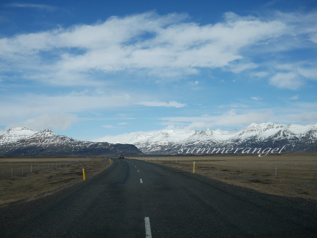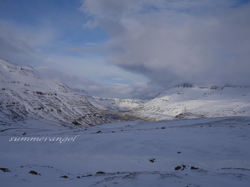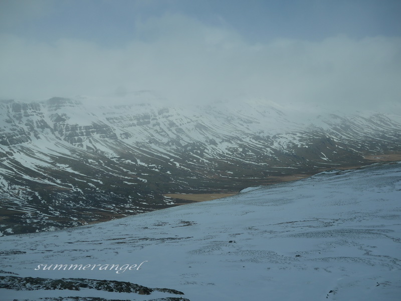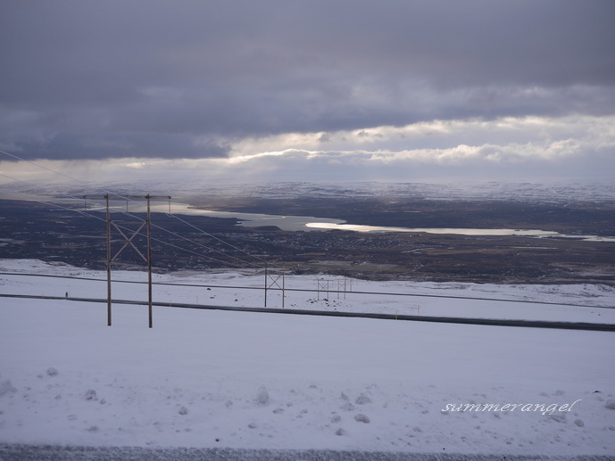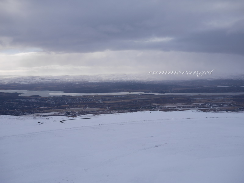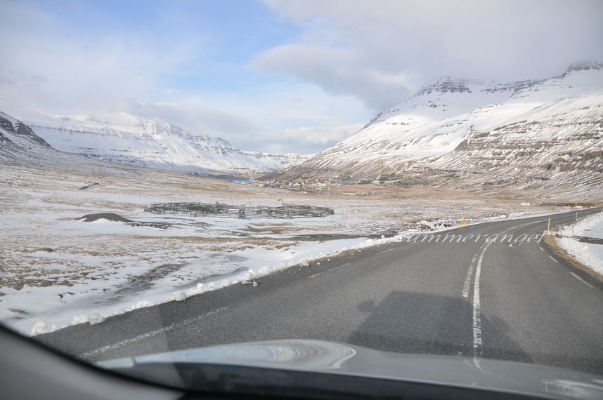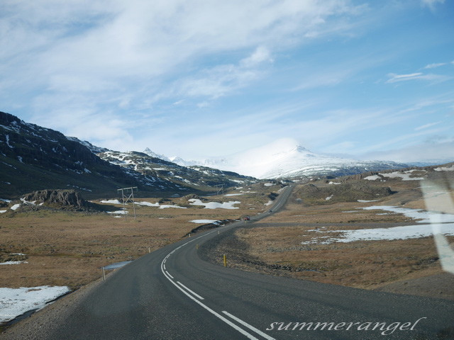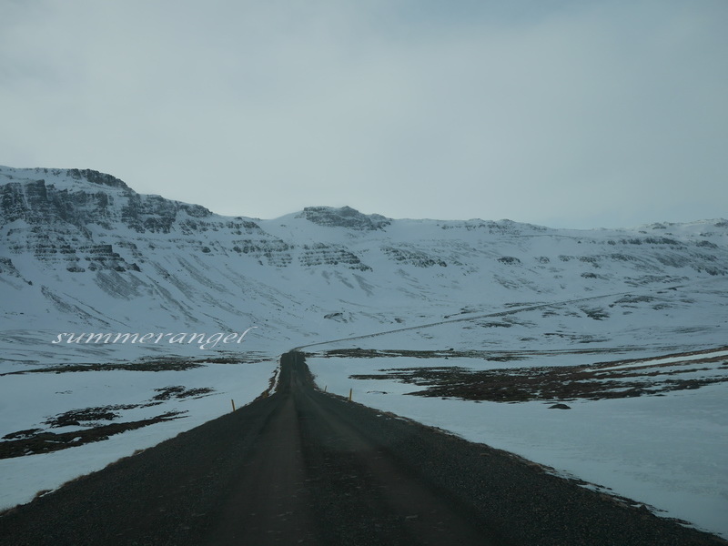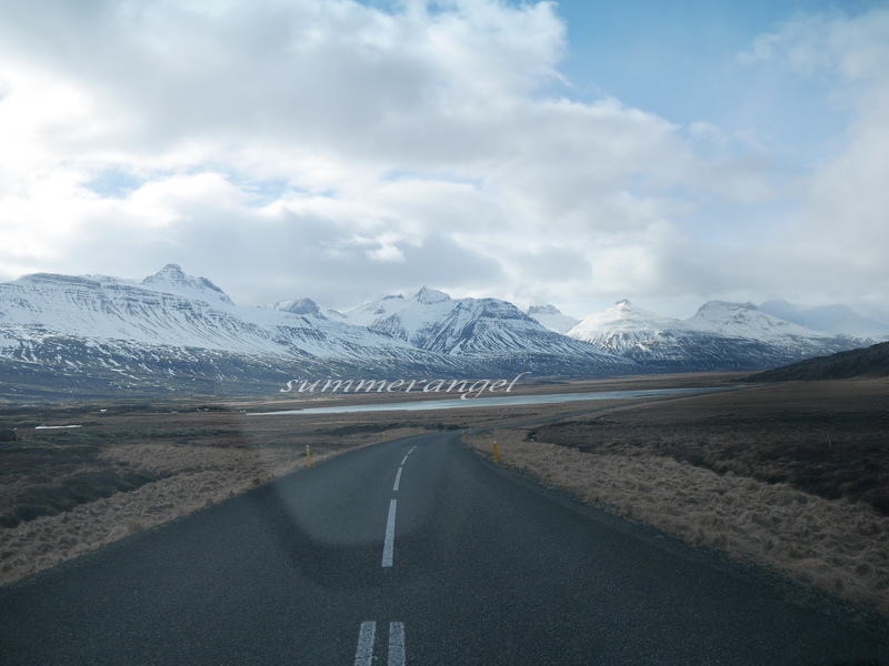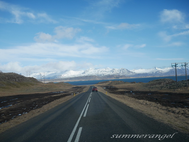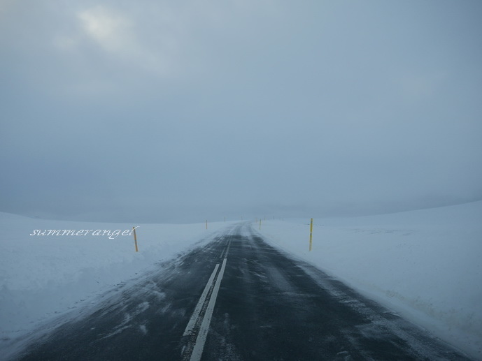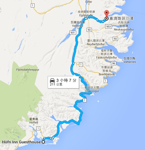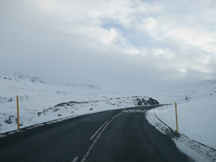 接下來要開上將近三小時才會抵達我們今晚下榻的Vinland Guesthouse,隨後轉往白日夢冒險王的場景小鎮。看這張圖就知道我們有一半的車程幾乎是沿著海岸走,之後切進台地。今天,我們終於遇到讓我害怕的大風雪,也懂為什麼當初老公猶豫是否要環島了。