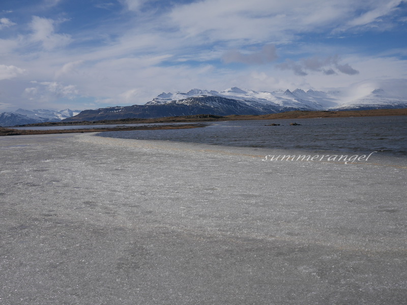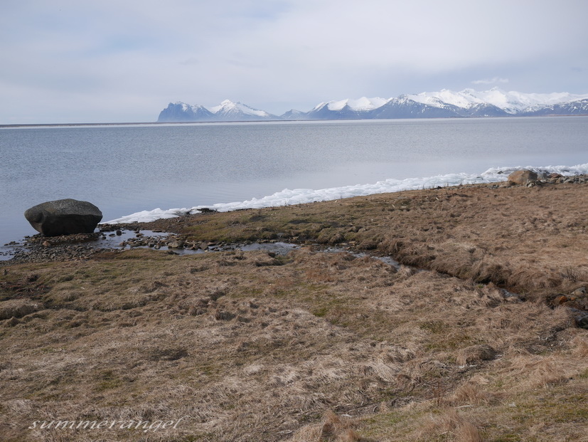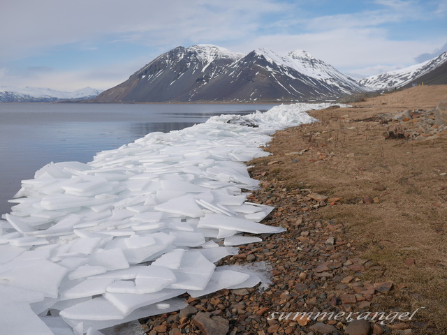 突然被海岸線破碎的冰層吸引,下車看看這些冰層是怎麼回事。很喜歡這道風景,淺淺的山,碎冰,圓石...