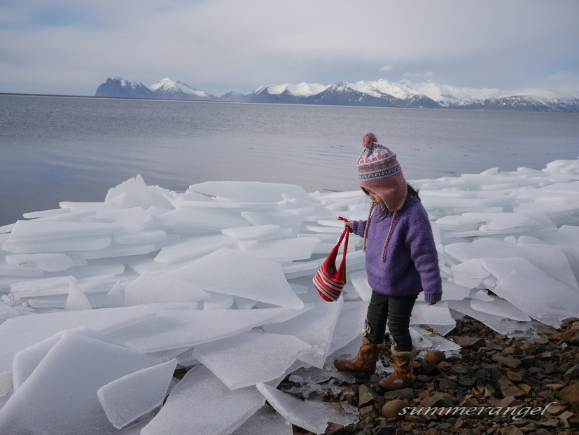 我跟老公討論著這些碎冰是人工還是天然?感覺很像人工碎冰後堆疊在岸旁。但應該沒人那麼無聊在這個荒郊野外做這種事,應該是溫度轉暖冰變薄被海浪拍碎推到岸上。