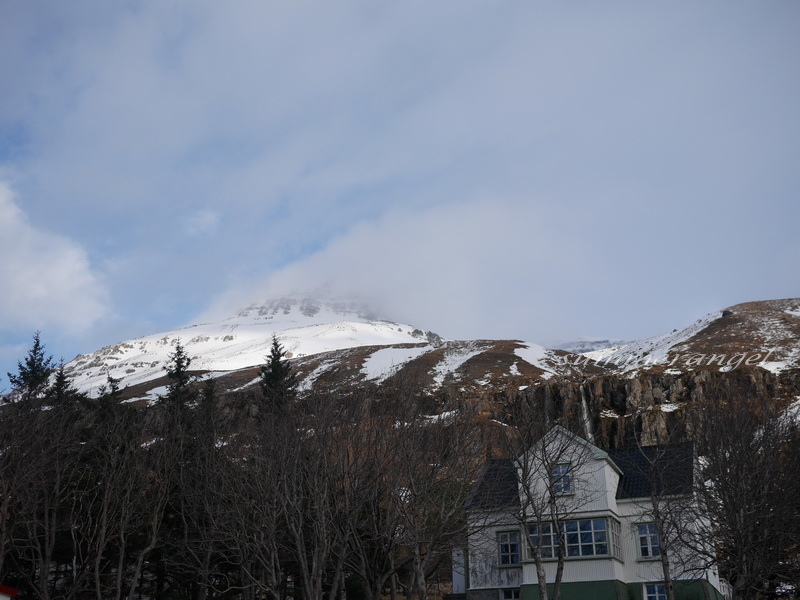 仔細看建築物後面有瀑布,涓涓細流配上幾棵枯樹,滿是詩意。不過再往山頂看,那種很像珠穆朗瑪峰噴射氣流吹過山頂的流線,又勾動我方才來時路狂風吹雪的驚險,趕緊催促老公回民宿。我很怕晚點颳起風雪一片漆黑。雖然老公說現在冰島晝長夜短,八九點天色還是很亮,依舊無法說服我繼續往山裡鑽。可能真的被剛才的風雪嚇到了!!