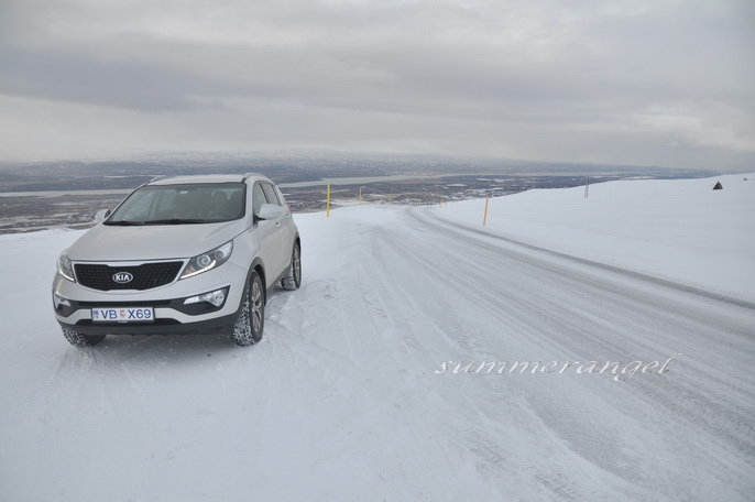 終於看到車子了!!冰島環島,開上半小時遇不到任何車輛是可能的。看到這輛汽車,覺得很安心。後來我們還遇到對象開過來的車,駕駛是一位年輕的大正妹。可能剛從風雪出來,看到我們她很大方的跟我們打招呼!
