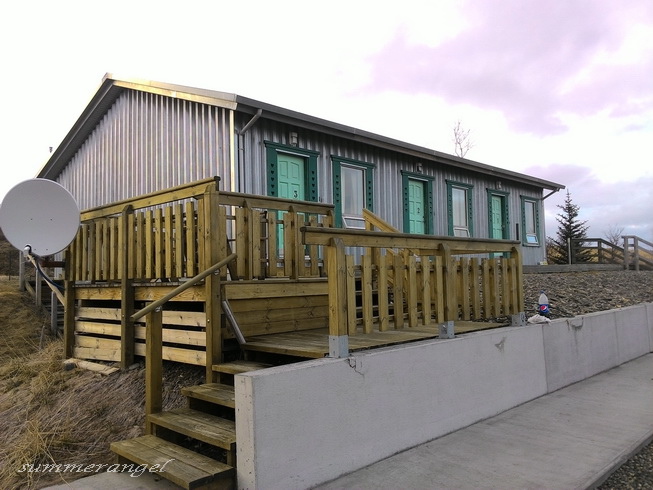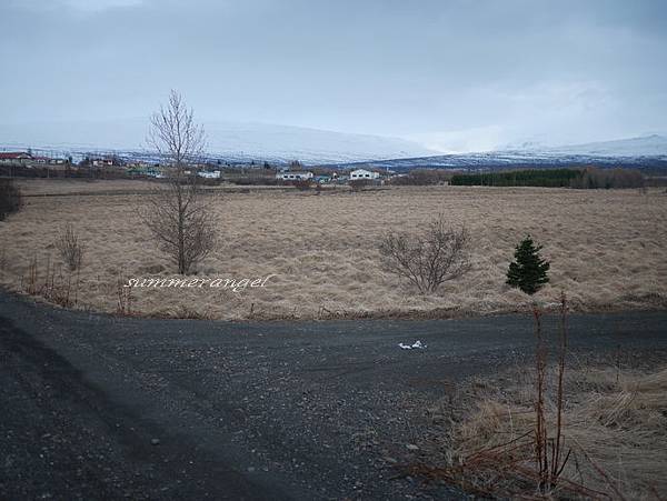 在還沒抵達Vinland Guesthouse之前,就愛上它周遭的環境了。枯黃的稻草臥倒整畝田,農家生活的畫面甚是愜意。不遠處是小鎮方面購物,民宿附近是田野,方便看極光。行程走至此,我很期待今晚能看到極光。但老公說今天的雲圖不太有機會....